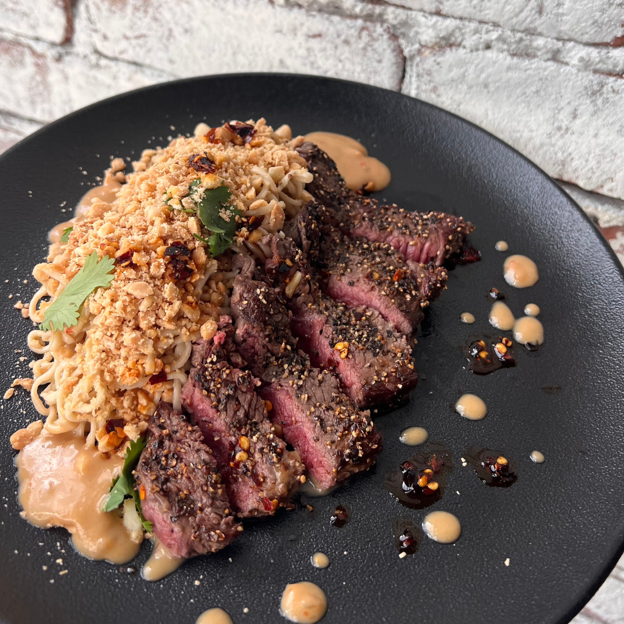 8oz pepper crusted prime strip steak, ramen, peanut sauce, green onion, chili oil, marcona almonds