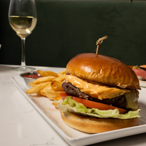 10oz dry aged prime, bacon onion marmalade, gruyere, lettuce, tomato, chipotle aioli, brioche, french fries