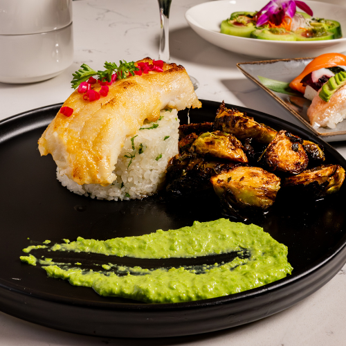 miso butter, fragrant scallion rice, brussels sprouts, sweet pea puree