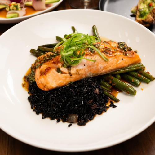 sweet chili glaze, forbidden black rice, szechuan green beans