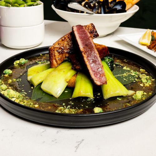 bigeye tuna, panko rice cake, baby bok choy, sweet chili sauce