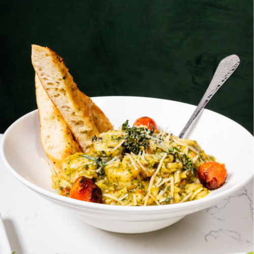shrimp, andouille sausage, roasted tomato, chipotle pesto cream, parmesan bread
