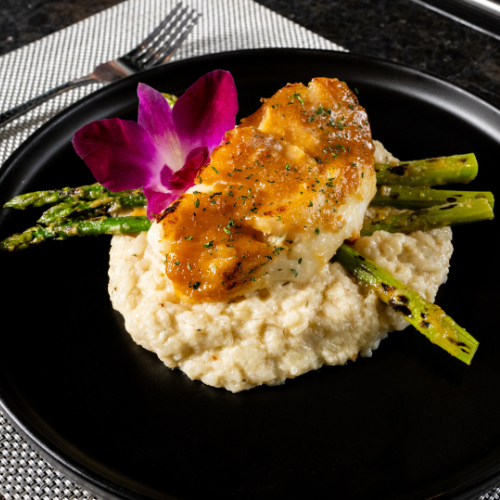 honey miso glaze, jumbo lump crab risotto, asparagus