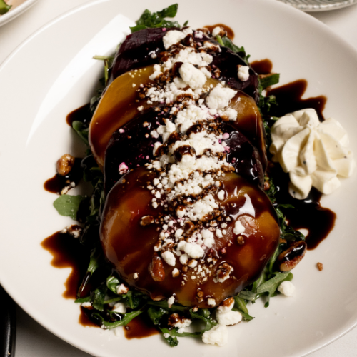 roasted red and golden salinas beets, goat cheese mousse, baby arugula, candied pecans, shallots, white balsamic vinaigrette