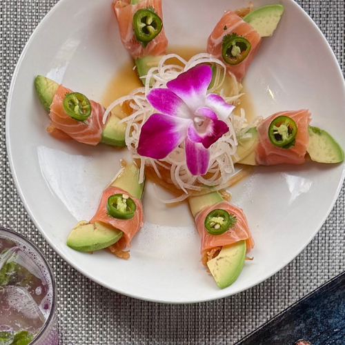 salmon, avocado, crispy onion, ponzu, serrano, cilantro