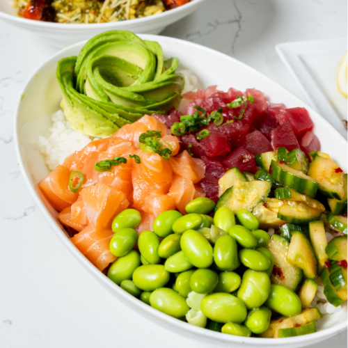 salmon, bigeye tuna, avocado, edamame, cucumber salad, furikake, poke sauce, white or brown rice