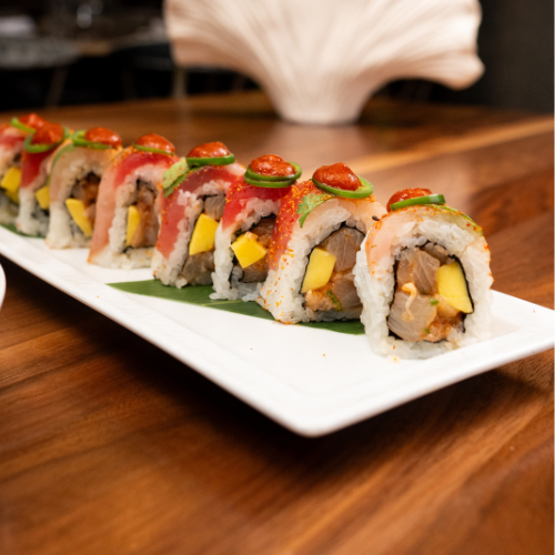 spicy yellowtail, mango, jalapeno, cilantro, ponzu, sriracha, togarashi, bigeye tuna & yellowtail