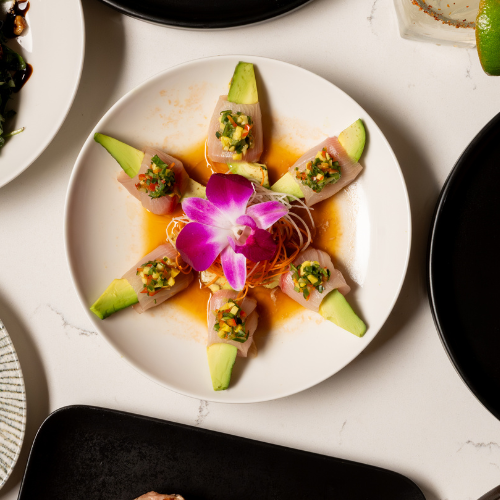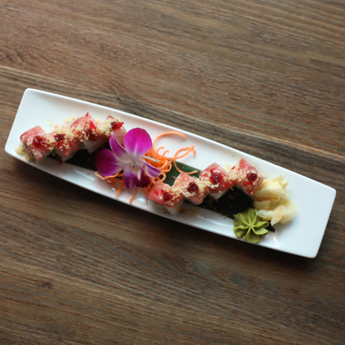 bluefin toro, avocado, wasabi aioli, carrots and daikon spirals, spicy ponzu, micro greens, kizami wasabi