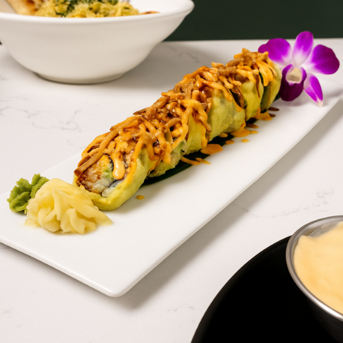 shrimp tempura, eel, asparagus, eel sauce, avocado, tobiko