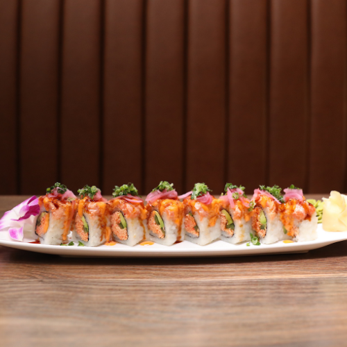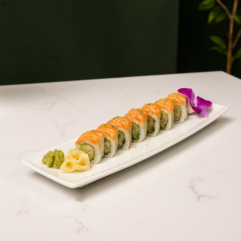 smoked salmon, cream cheese, cucumber, serrano, spicy mayo, eel sauce, tempura flakes