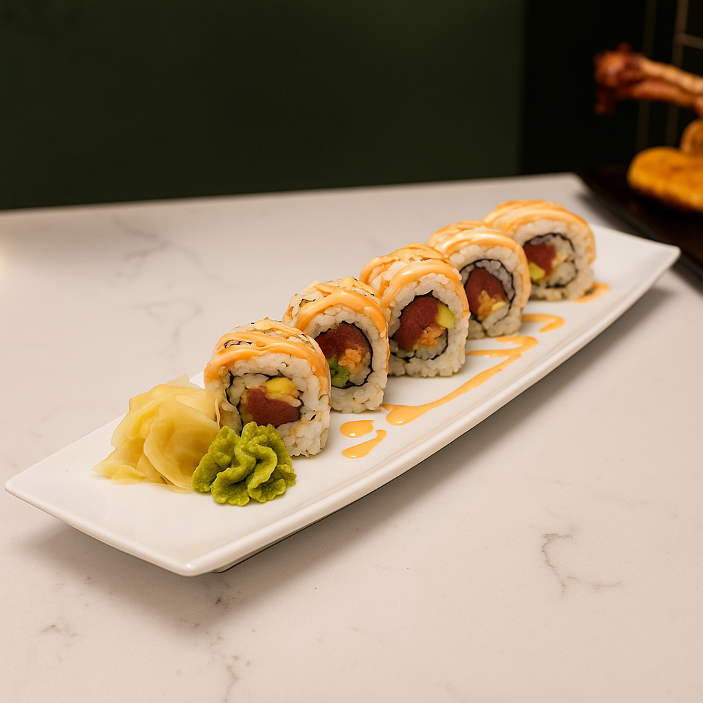 crab, spicy tuna, avocado, krispynoodle, tiger sauce, tempura fried