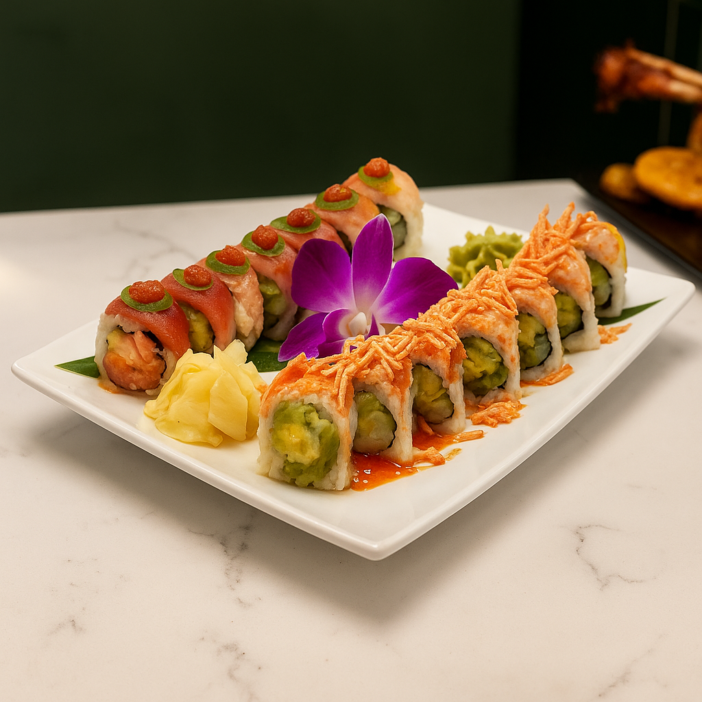 tempura shrimp, snow crab, habanero onions, cilantro, baked halibut, serrano, sriracha, ponzu, togarashi