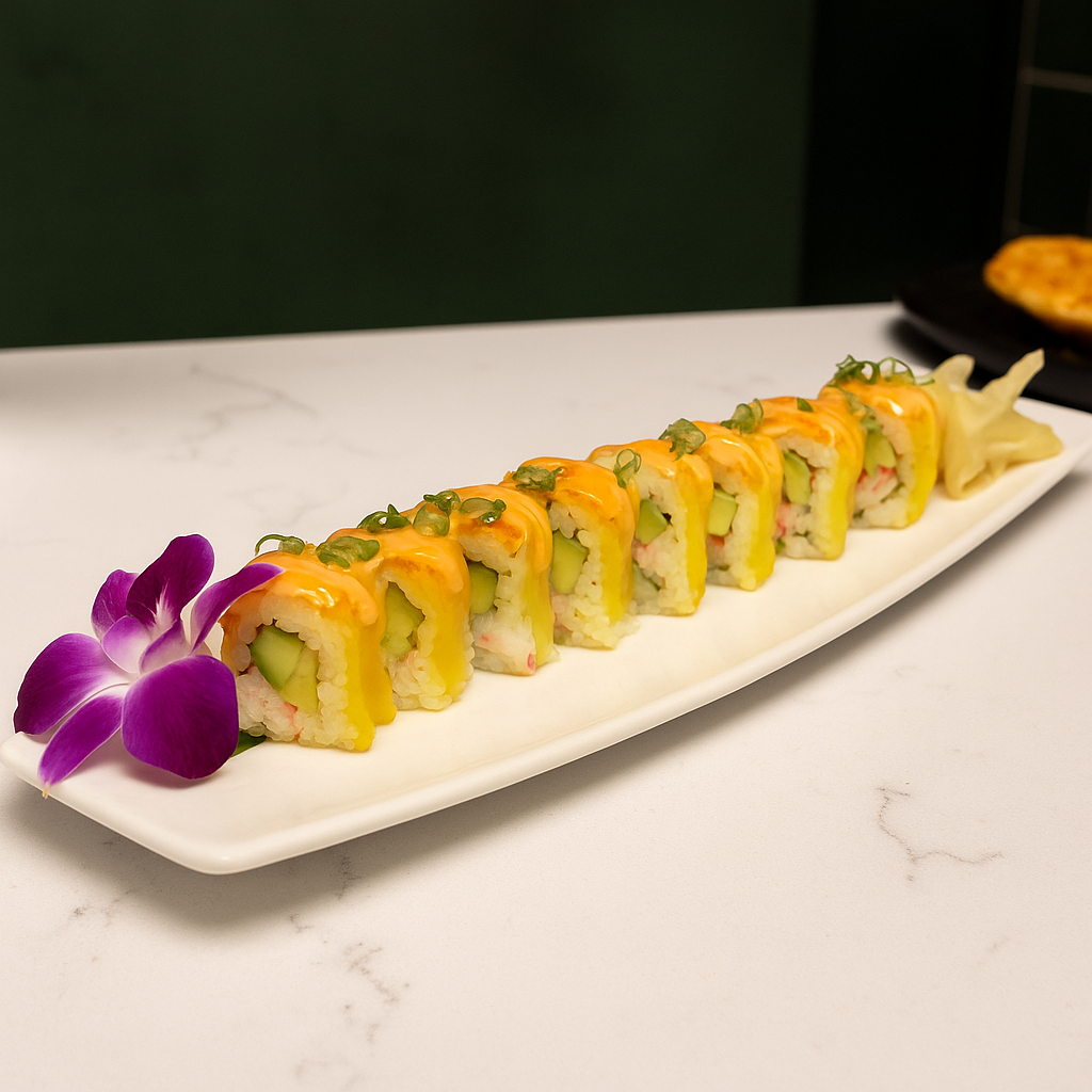 coconut shrimp, serrano, cucumber, cream cheese, avocado, mango, eel sauce, candied pecans, soy paper