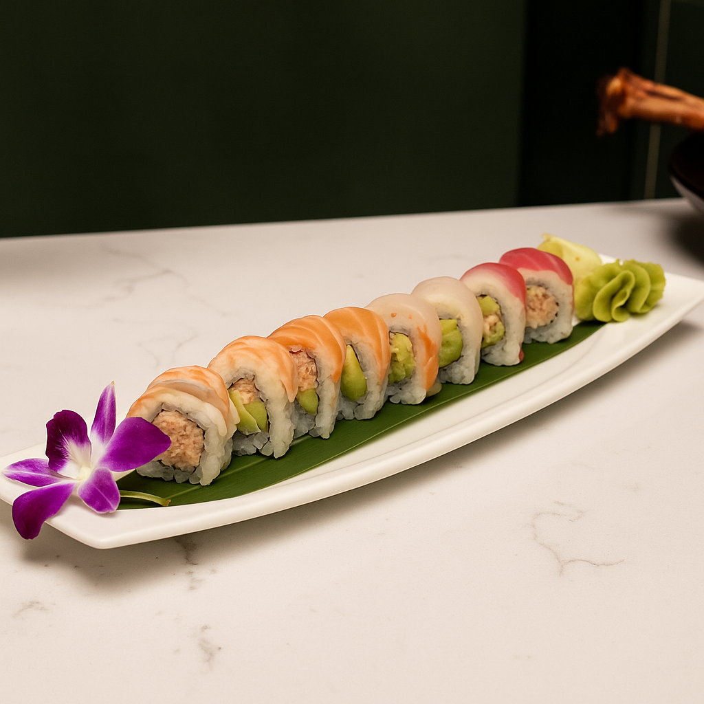 tempura shrimp, spicy tuna, avocado, cucumber, tobiko, asparagus, tempura flakes, eel sauce