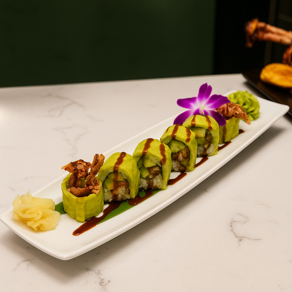 soft shell crab, cucumber, avocado, eel sauce, soy paper